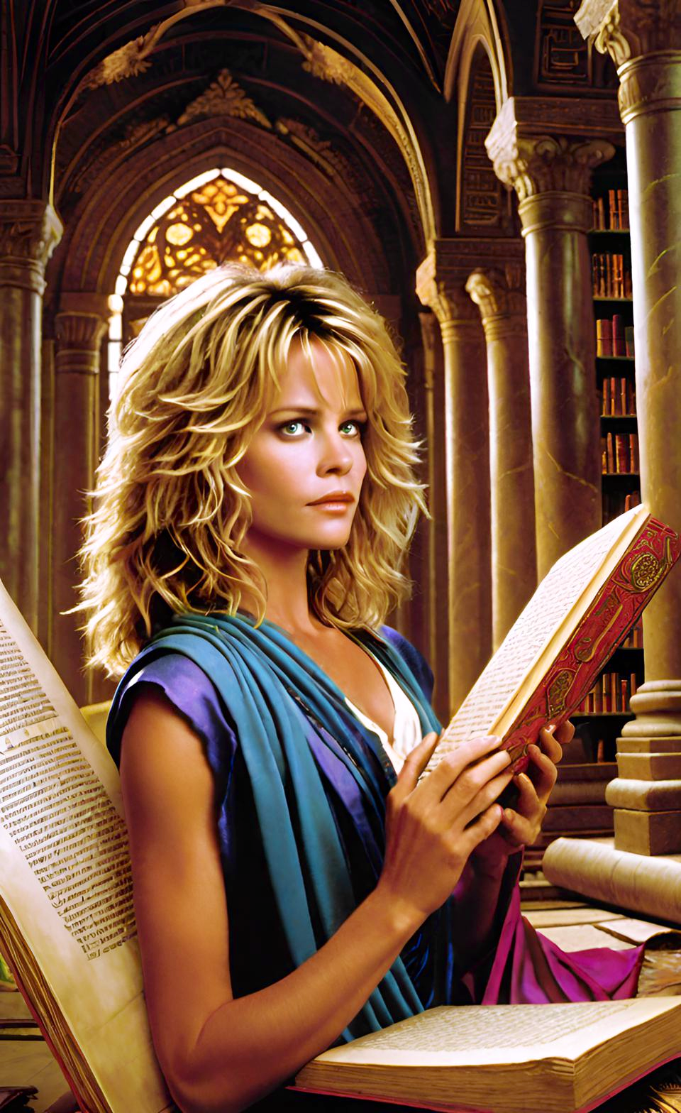 I used the image in Figure 14 as a reference image for Mr. Wombo along with this text prompt: "a very young Kate Jackson has long black hair, Kate Jackson a pretty twenty year old girl, Kate Jackson dressed Victoria's Secret style in a low-cut silk shirt, Kate Jackson inside a technologically-advanced time travel portal, the time portal has fractal complex control panels built into its arched structure".