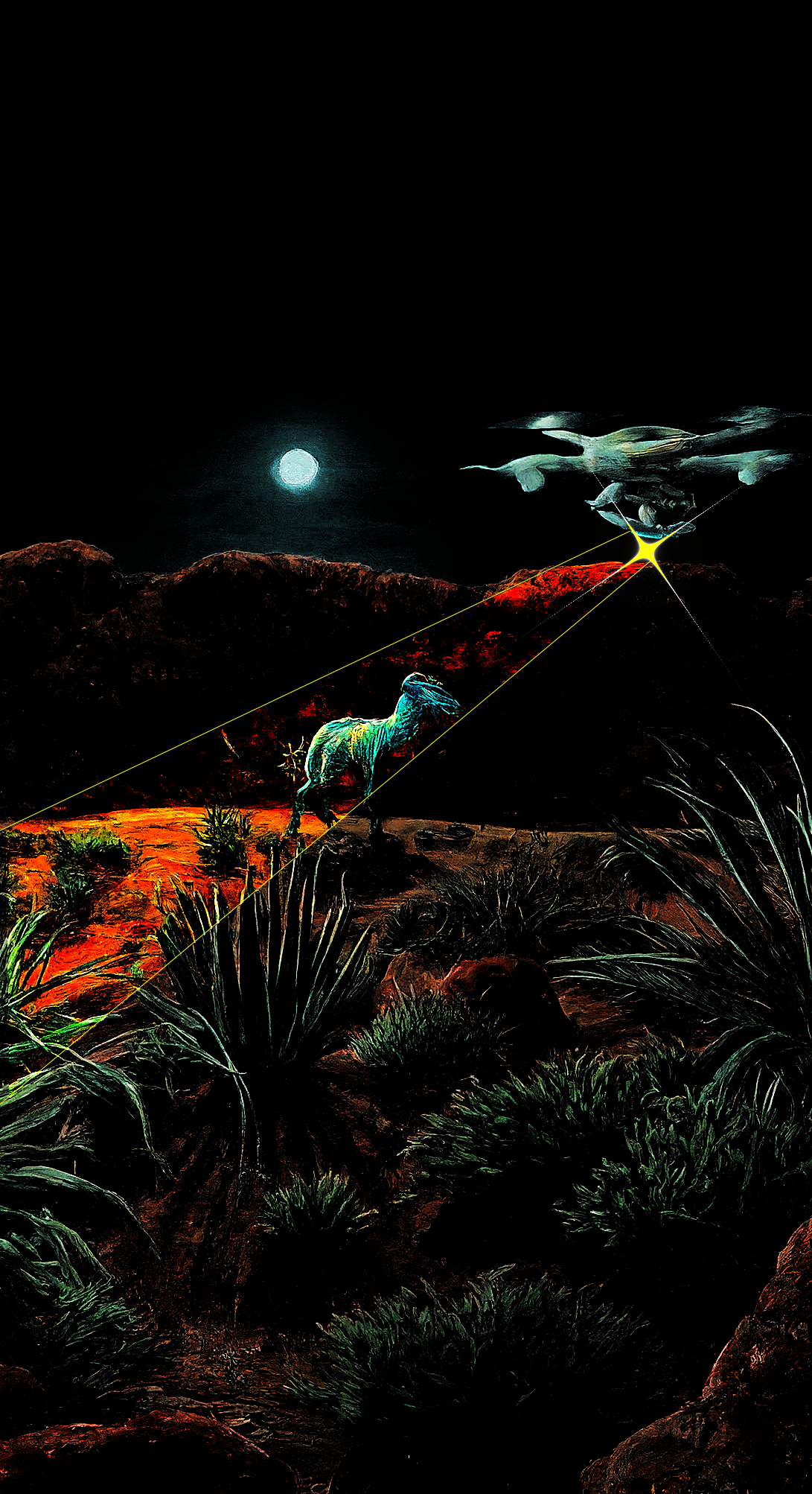 Futuristic drones. I asked Gemini to generate an image depicting a flying drone of the year 2224 that has infrared sensors and is being used by human colonists to search (during the night) the landscape of an exoplanet for alien animals that are moving among sparse and exotic desert plants. I modified one of the Gemini-generated images to produce the image shown in Figure 2. I played around with the lighting in an attempt to make it look like the drone was illuminating the alien animal.