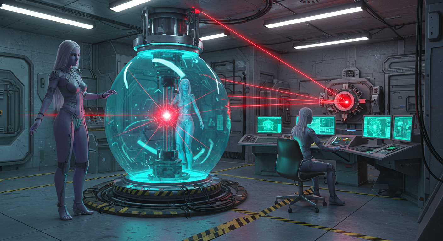 In Figure 13, I can imagine the being a depiction of a test of the equipment that will be used to extract nanites from the body of the Hua. I'm not sure how to account for the various light rays in Figure 14. Maybe the glowing device inside the nanite containment field with the test subject is extracting nanites from her body while the light beams outside the containment field are scanning for any indication of nanites that are leaking through the containment field.